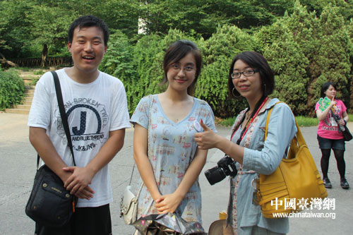 北京交通大学赵晖、武汉大学喻释然、台湾大学李晓蓉三人离别前合影留念(中国台湾网 李丹 摄)