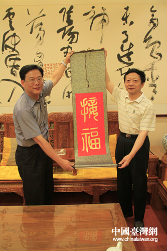 宋庆龄基金会副秘书长乔健与台湾十大杰出青年办公室主任彭铭渊交换礼物。(中国台湾网 赵婧 摄)
