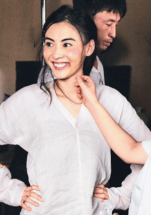 张柏芝昨天带瘀伤妆开工,笑容灿烂。图片来源:台湾《联合报》
