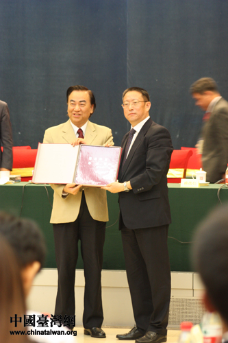 “杰青团”荣誉团长冯沪祥和郑建邦互赠礼物。(中国台湾网 冯江 摄)