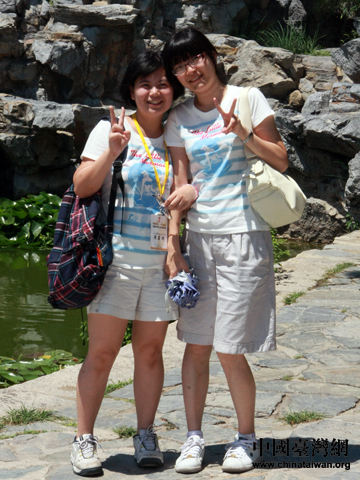 来自北京交通大学的张爱鑫和台湾东吴大学的黄芸羽特意身着同款衣服组成“海峡姐妹花”。(中国台湾网 张维佳 摄)