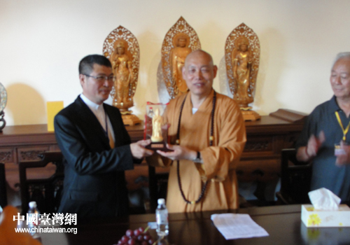 台湾金兰会会长台南正统鹿耳门圣母庙主委王增荣与普陀山佛教协会会长道慈大和尚代表双方互换礼物(图片来源:舟山市台办)
