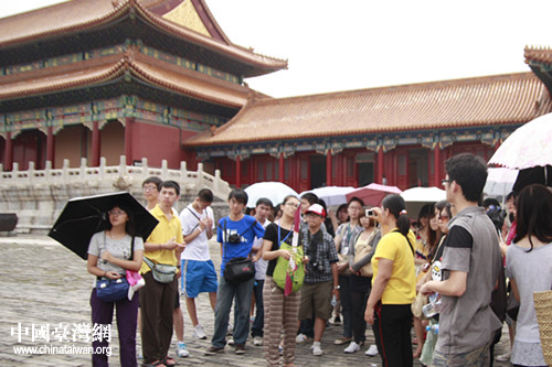 两岸学生在故宫博物院中听导游讲解故宫的历史(中国台湾网 刘承思 摄)