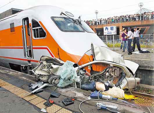 台湾男子黄富国驾车闯公路与铁路交叉道,被自强号火车撞上推挤到内坜火车站,惨死车内。图片来自台媒