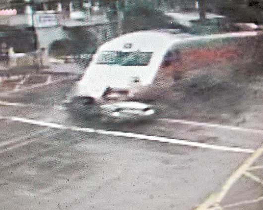 监视器拍下轿车被自强号火车撞上的瞬间。图片来自台媒