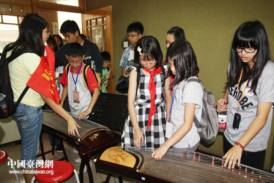 音乐教室内,学生们好奇地抚弄古筝。(中国台湾网 王思羽 摄)