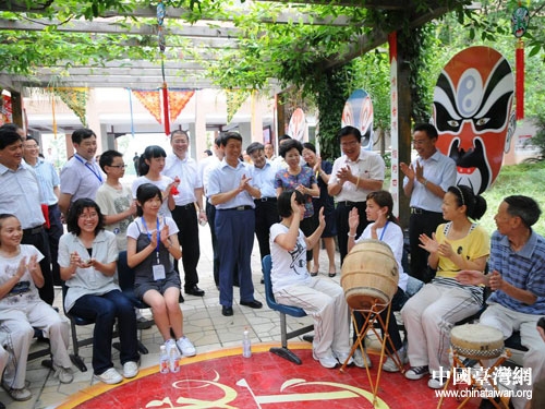 四川与台湾小朋友击掌欢庆合作表演川剧锣鼓成功。图片来源: 四川省台办