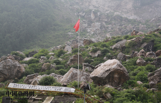 原来的北川中学在地震后已经成了一片残垣断壁,只剩下这面高高耸立的五星红旗,似乎在向人们诉说,这里曾经传出过朗朗书声,这里曾经有北川孩子们的梦想。(中国台湾网 赵辉 摄)