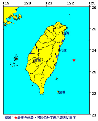 各地最大震度:花莲几崎2级、花莲市2级、台东长滨2级、宜兰南澳2级、彰化市2级、花莲市、合欢山、台中市和新北市地区分别为1级。(中国台湾网 刘海伟)