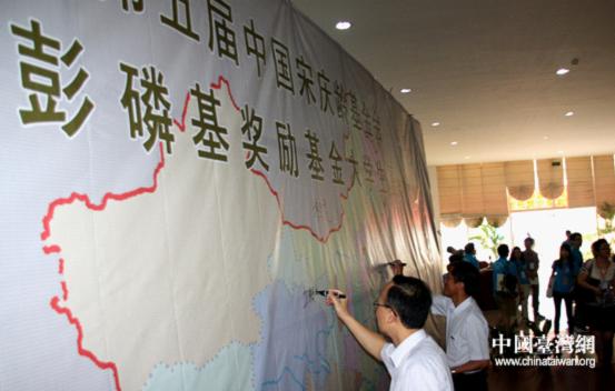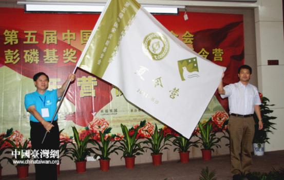 中国宋庆龄基金会基金部副部长李晓峰在开营仪式上为台籍学生代表授旗,并宣布夏令营活动正式启动。(中国台湾网 高斯斯 摄)