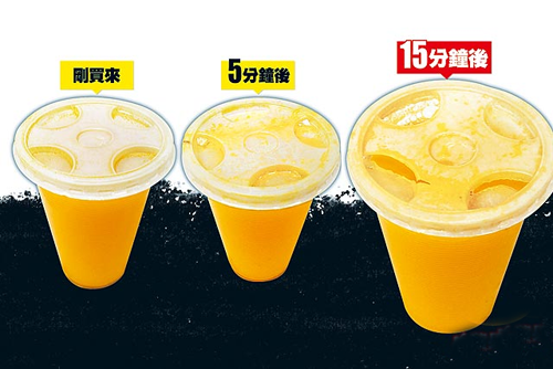 柳橙汁竟在20分钟内溶解部分杯盖,连检验人员也难以置信。图片来源:台湾媒体