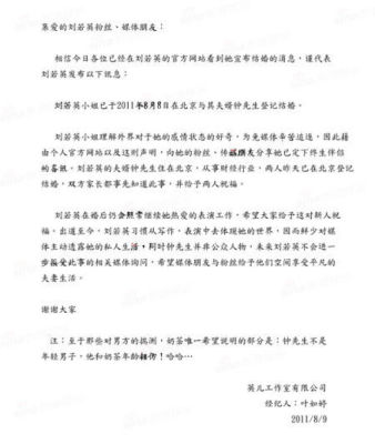 刘若英经纪人发声明稿,证实刘若英已于昨天(8日)在北京结婚。图片来自网络