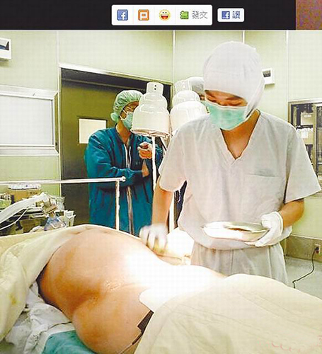 不知被拍摄的产妇躺在产台上,医护人员正在她肚皮上消毒。图片来源:台湾媒体