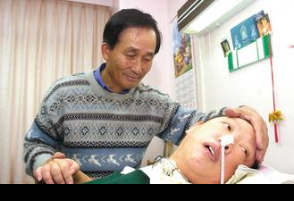 何维庄(右)因为医疗疏失获赔,但今年4月已去世。图为她的丈夫台大教授赖秀穗(左)在病榻照顾,夫妻情深。(来源:台湾《联合报》)