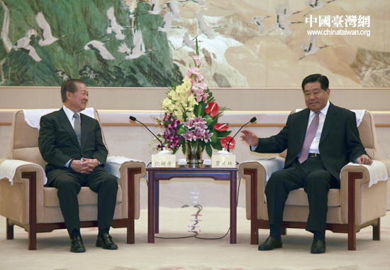 中国台湾网8月25日北京消息 25日下午,中共中央政治局常委、全国政协主席贾庆林在全国政协礼堂会见了台湾两岸民意代表交流基金会董事长饶颖奇为团长的台湾民意代表交流参访团一行。(中国台湾网 田云鹏 摄)