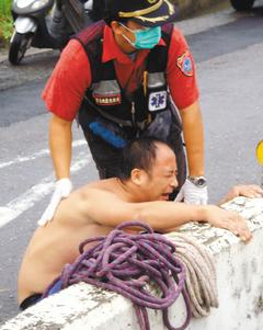 林俊宏当场痛哭并几度要冲入水中寻找父亲,被消防人员劝止。 来源:台湾《联合报》