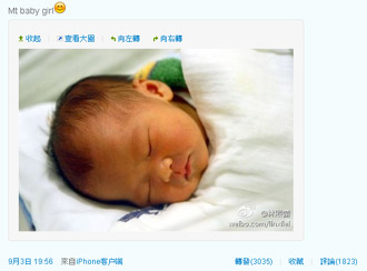 林熙蕾3日晚上在微博po出刚出生的爱女照片。图片来源:台湾《联合报》