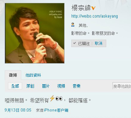 杨宗纬在微博中写道“希望所有……都能罹癌”。图片来源:台湾媒体