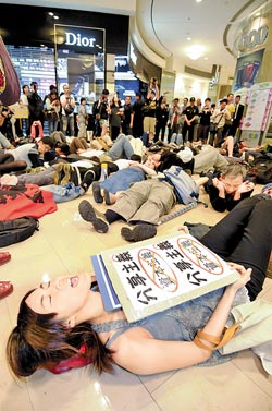呼应“占领华尔街”运动的台湾地区民众,发动包围台北地标101大楼。(图片来源:台湾《中国时报》)