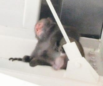 这只猕猴大闹三小时后,围捕人员射出四支麻醉箭,猕猴中箭跌落高铁车厢上。(图片来源:台湾《联合报》)
