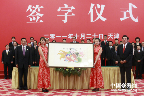 海协会会长陈云林向海基会董事长江丙坤赠送礼物“连年有余”。(中国台湾网 陈佳慧 摄)