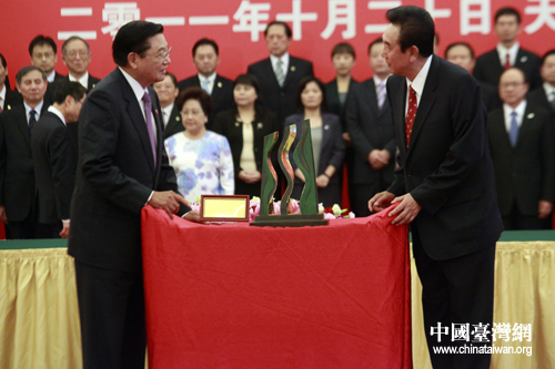 海基会董事长江丙坤向海协会会长陈云林赠送礼物“行健不息”。(中国台湾网 陈佳慧 摄)