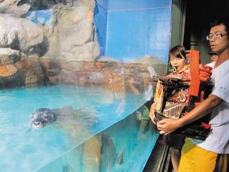 嘉义奉天宫开台妈祖临时“指示”信徒到台湾海洋馆参观,信徒双手捧着神像“观赏” 缸里的海豹。图片来自台湾媒体