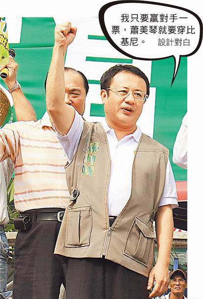 中国台湾网11月2日消息 据台湾媒体报道,绿营民意代表赖坤成昨日出席活动时说,“只要我赢对手一票,台下的萧美琴愿穿比基尼从玉里桥走到圆环”。蔡英文顿时沉下脸孔,伸手拍拍赖的背,要赖别再讲,萧则脸色铁青。
