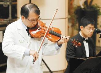 中国台湾网11月9日消息 据台湾《联合报》报道,台大医院昨天举办医师节感恩音乐会,担纲的主角一位是执行换肾手术的台大外科医师蔡孟昆,一位是换肾的音乐家庄天岳,医病两人合奏“爱的礼赞”,赢得满堂采;蔡孟昆说,他已走出误植艾滋器官事件的低潮期,靠的就是拉小提琴减轻压力。