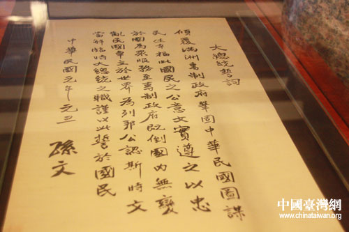 孙中山手书“中华民国第一任临时大总统”誓词。(中国台湾网 宿静 摄)