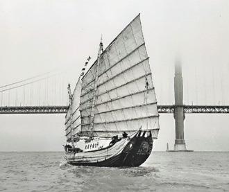台湾首艘横渡太平洋的古帆船,当年历尽艰辛航抵美国,通过旧金山大桥。(图片来自台湾媒体)