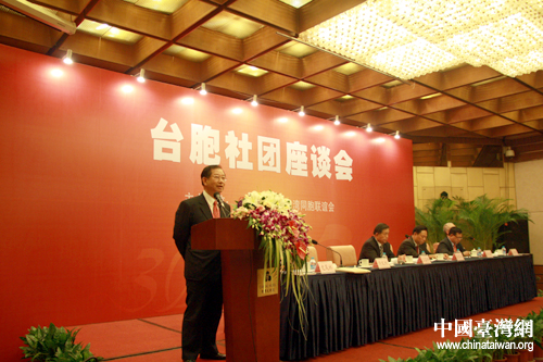 中国台湾网11月14日北京消息 作为中华全国台湾同胞联谊会(简称全国台联)成立三十周年庆典活动之一的“台胞社团座谈会”,今天下午在北京首都大酒店召开。座谈会以世界各地台胞社团人士为主体,对于加强海外、港澳和台湾岛内台胞社团之间的沟通与联系,共谋合作与发展,推动两岸民间交流深入发展,促进两岸关系和平发展,具有十分重要的意义。