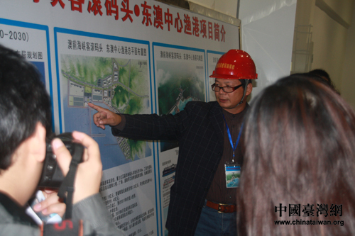 澳前组团建设指挥部的工作人员介绍码头的建设和施工情况。(中国台湾网 王君飞 摄)