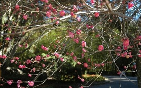 中国台湾网12月21日消息 据台湾《联合报》报道,台湾枫叶刚红,冬至还没到,可台中武陵农场的红梅花竟然开了,武陵路旁10余株梅树均见红花悄悄上枝头,提早揭开赏梅季。