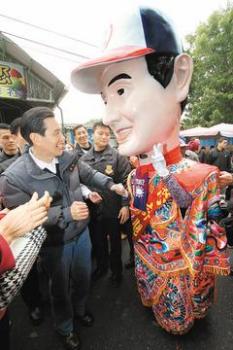 马英九(左)上午前往南投拜票,看见自己竞选的大人偶,喜笑颜开。(图片来源于:台湾《联合报》)