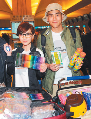 彭于晏准备补充营养品、糖果、跳绳、玩具黏土、画笔及海绵宝宝贴纸;郭采洁得知当地缺乏电力供照明,特地准备手动充电手电筒,同时带了色纸和彩色铅笔,盼和当地的小朋友一起记录这趟旅程。(中国台湾网 李帅)