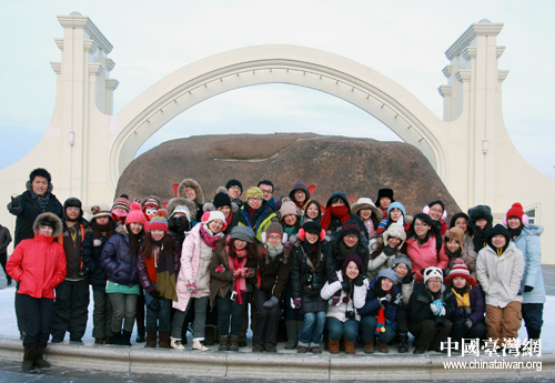 两岸青年学子在哈尔滨太阳岛上合影留念。(中国台湾网 于斯文 摄)