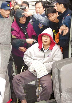 五月天乐团主唱阿信的堂哥陈文宗(图前坐轮椅),因遭枪击下半身瘫痪,涉嫌由女看护陈美云(图后穿红衣妇人)推着轮椅四处贩毒,昨日被台北市刑侦队逮捕送办。(图片来自台湾媒体)