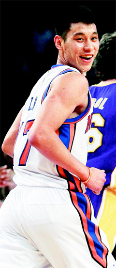 尼克斯队林书豪昨天对湖人队演出优异,他上半场得分后带着笑容。图片来源:台湾《联合报》