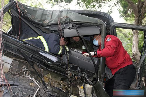 中国台湾网2月17日消息 据台湾媒体报道,金门县今天上午7时50分许传出一起军车撞树事故,1辆隶属台军金门防御区的10吨重军用大货车行经太武山联勤支部门口,疑因闪避小狗撞上树龄约50年的大榕树,军车车头在猛烈撞击下几乎全毁,龚姓士兵(21岁,高雄人)驾驶该车辆,左腿骨折受困车内约30分钟。