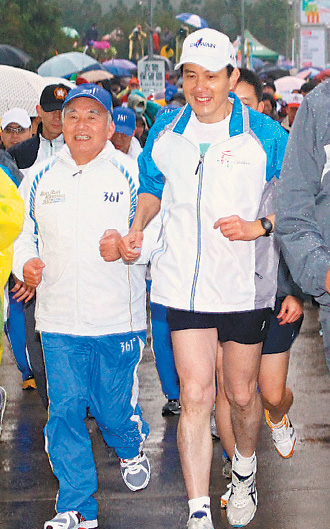 马英九做暖身操时穿卡其色风衣,起跑时脱掉换白色运动风衣,越跑越起劲,最后脱到只剩大会T恤,花25分钟跑完全程。