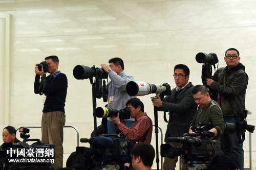 4日上午11时,十一届全国人大五次会议在人民大会堂三楼金色大厅举行了新闻发布会,大会发言人李肇星就会议议程和人大工作相关的问题回答了中外记者的提问。图为忙碌工作的摄影记者。(中国台湾网 王伟 摄)