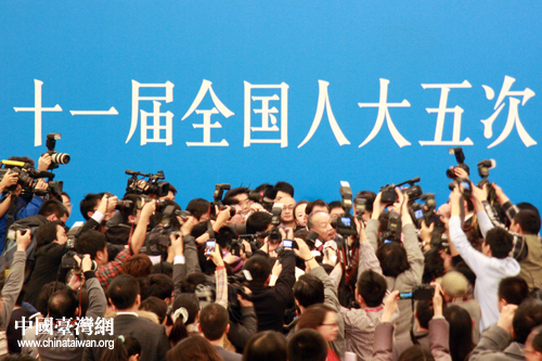 4日上午11时,十一届全国人大五次会议在人民大会堂三楼金色大厅举行了新闻发布会,大会发言人李肇星就会议议程和人大工作相关的问题回答了中外记者的提问。图为发布会后,各路媒体“围堵”发言人。(中国台湾网 王伟 摄)