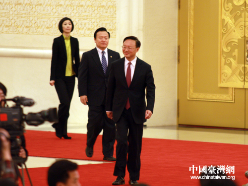十一届全国人大五次会议今天上午10时在人民大会堂三楼金色大厅举行记者会。外交部部长杨洁篪向记者问候。(中国台湾网 王伟 摄)