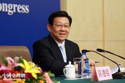 十一届全国人大五次会议7日在梅地亚中心举行记者会,商务部部长陈德铭就“扩消费促流通和发展对外经贸”的相关问题回答中外记者的提问。图为会议开始前,陈德铭向记者微笑致意。(中国台湾网 王伟 摄)