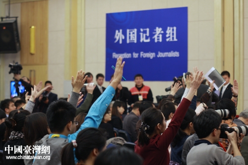 十一届全国人大五次会议7日在梅地亚中心举行记者会,商务部部长陈德铭就“扩消费促流通和发展对外经贸”的相关问题回答中外记者的提问。图为提问现场。(中国台湾网 王伟 摄)