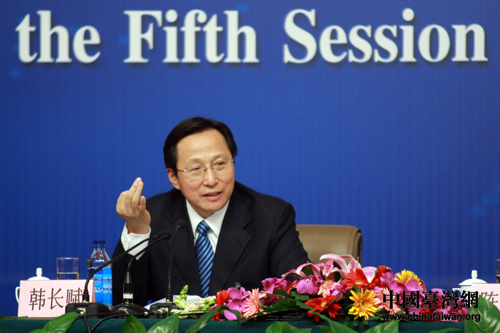 十一届全国人大五次会议举行记者会,农业部部长韩长赋回答中外记者的提问。(中国台湾网 王伟 摄)