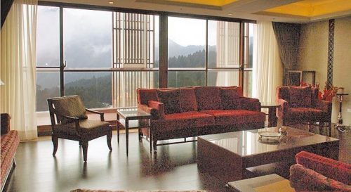 台湾阿里山宾馆总统套房客厅配有价值百万新台币的桧木家具和摆饰,从房内可眺望山景。(图片来源于台媒)