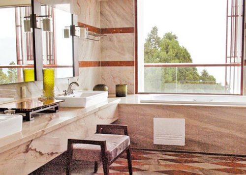 台湾阿里山宾馆总统套房主卧室卫浴采用价值80多万新台币的琉璃艺品和意大利进口石砖。(图片来源于台媒)
