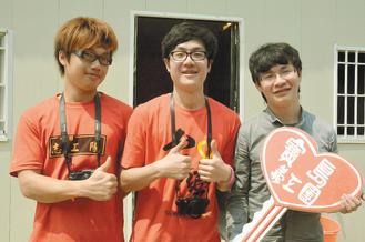 大陆交换学生夏之舟(右起)、潘罗商和台湾朋友林沿佐(左),跟着台湾宝岛行善义工团为老人盖房子。来源:台湾《联合报》